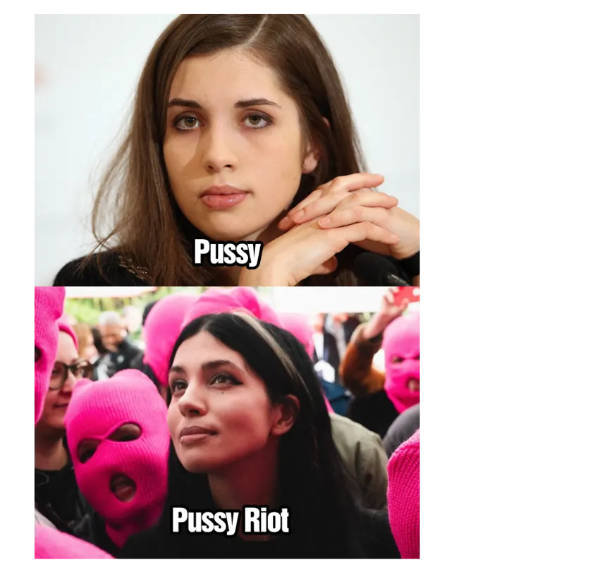 En argot anglais, pussy veut dire à la fois chatte et poule mouillée. Pussy Riot (« émeute de chattes ») est un groupe punk rock féministe russe.