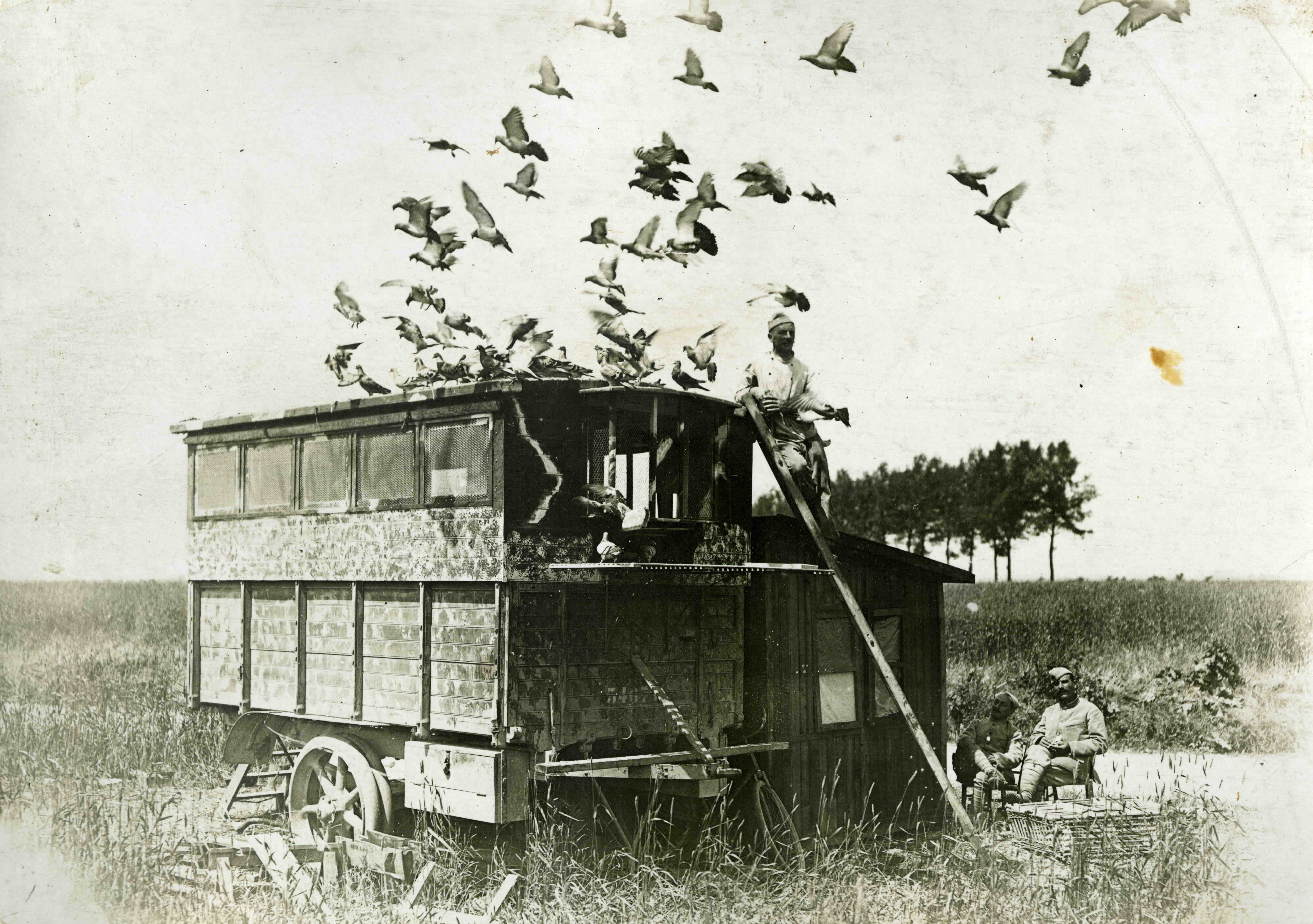 Colombier militaire français. Les pigeons étaient indispensables aux transmissions en 1914-1918, et le resteront lors de la Seconde Guerre mondiale. © Jean-Léon Nicéphore / Musée de la Grande Guerre, Meaux.