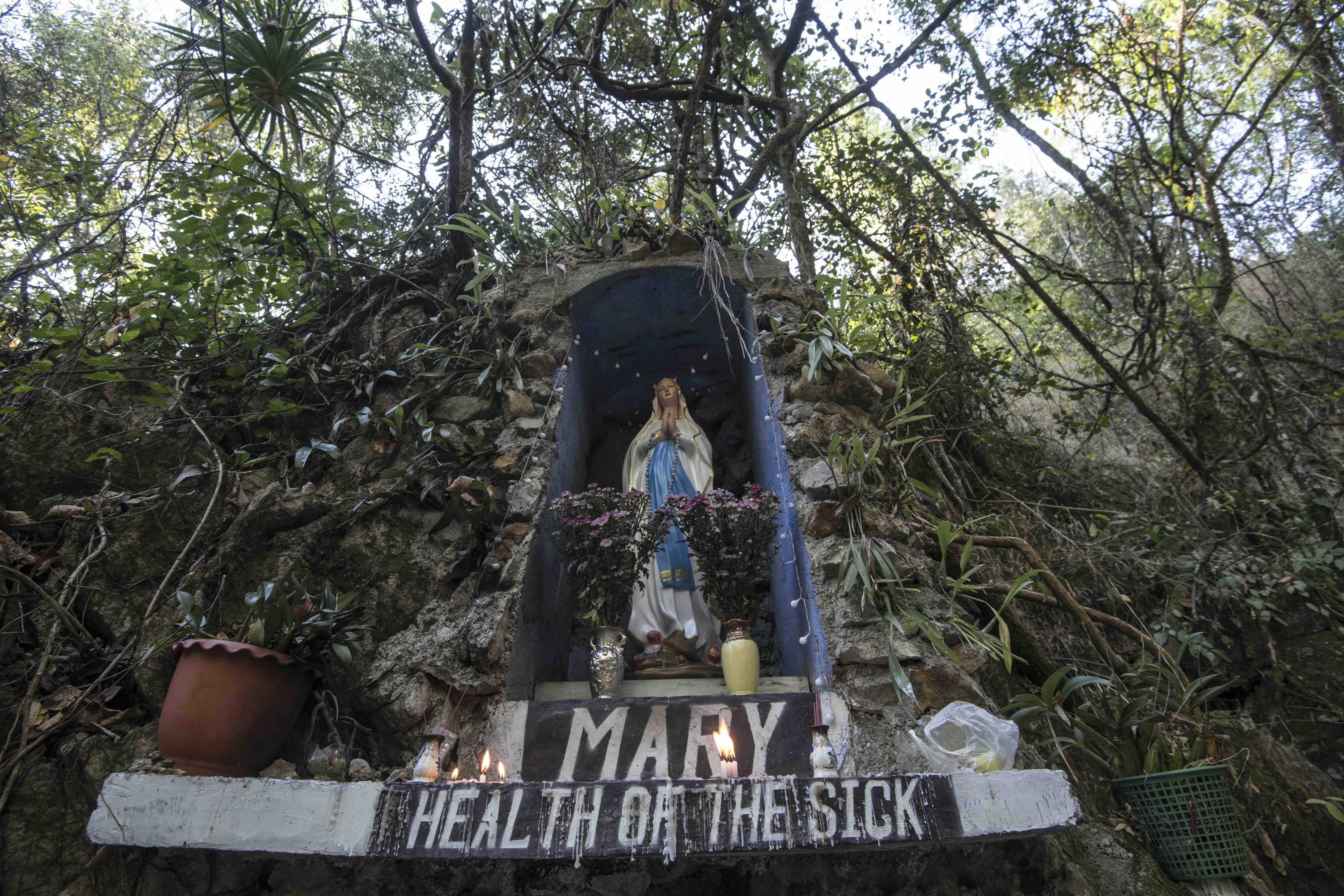 Une statue de la Vierge Marie à l’entrée de l’hôpital Luke, dans une région de l’État karenni où se côtoient catholicisme, baptisme, bouddhisme et animisme. — © Thierry Falise