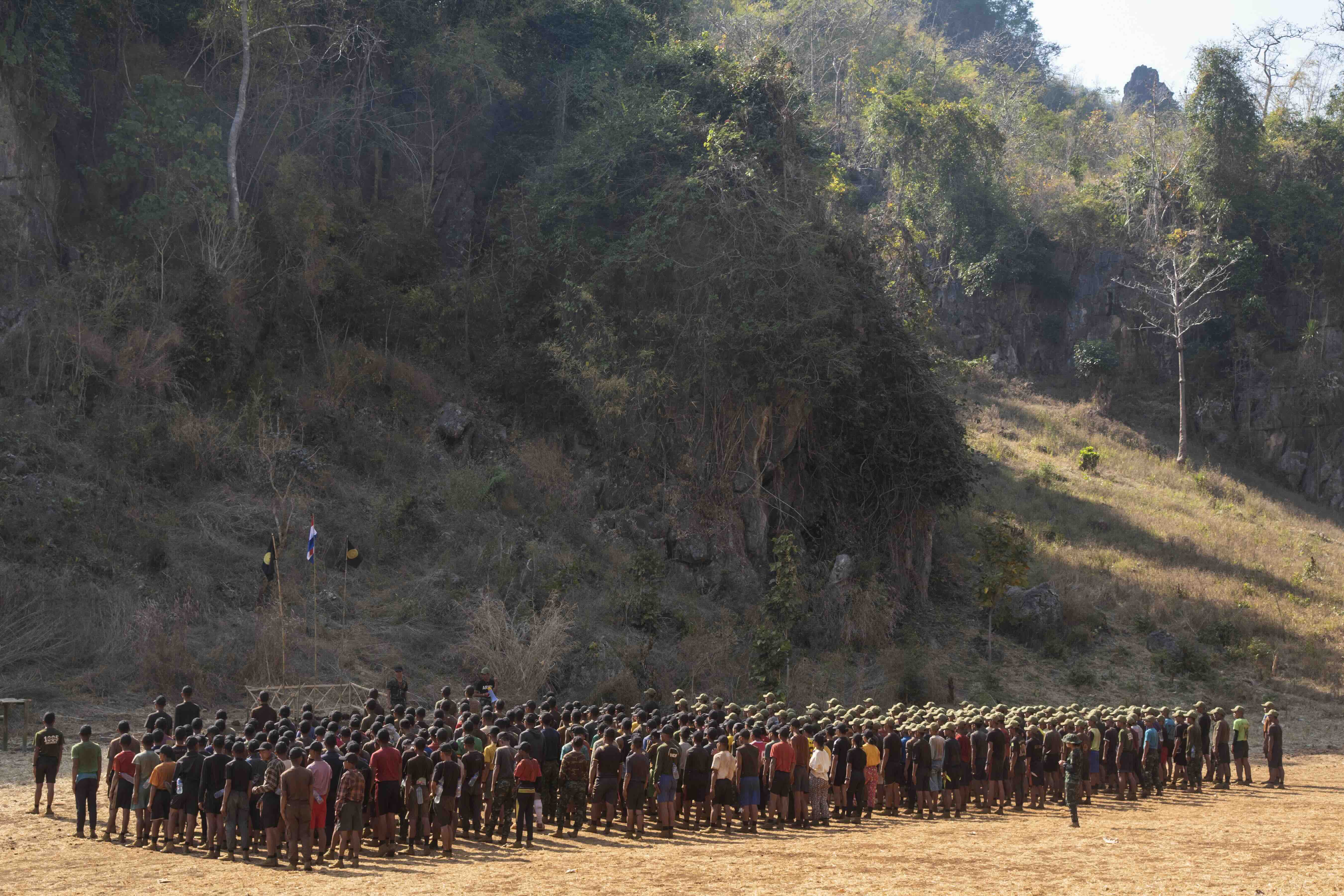 Des jeunes recrues d’un nouveau groupe armé en lutte contre l’armée birmane s’entraînent dans un camp de base de la région de l’État karenni. — © Thierry Falise