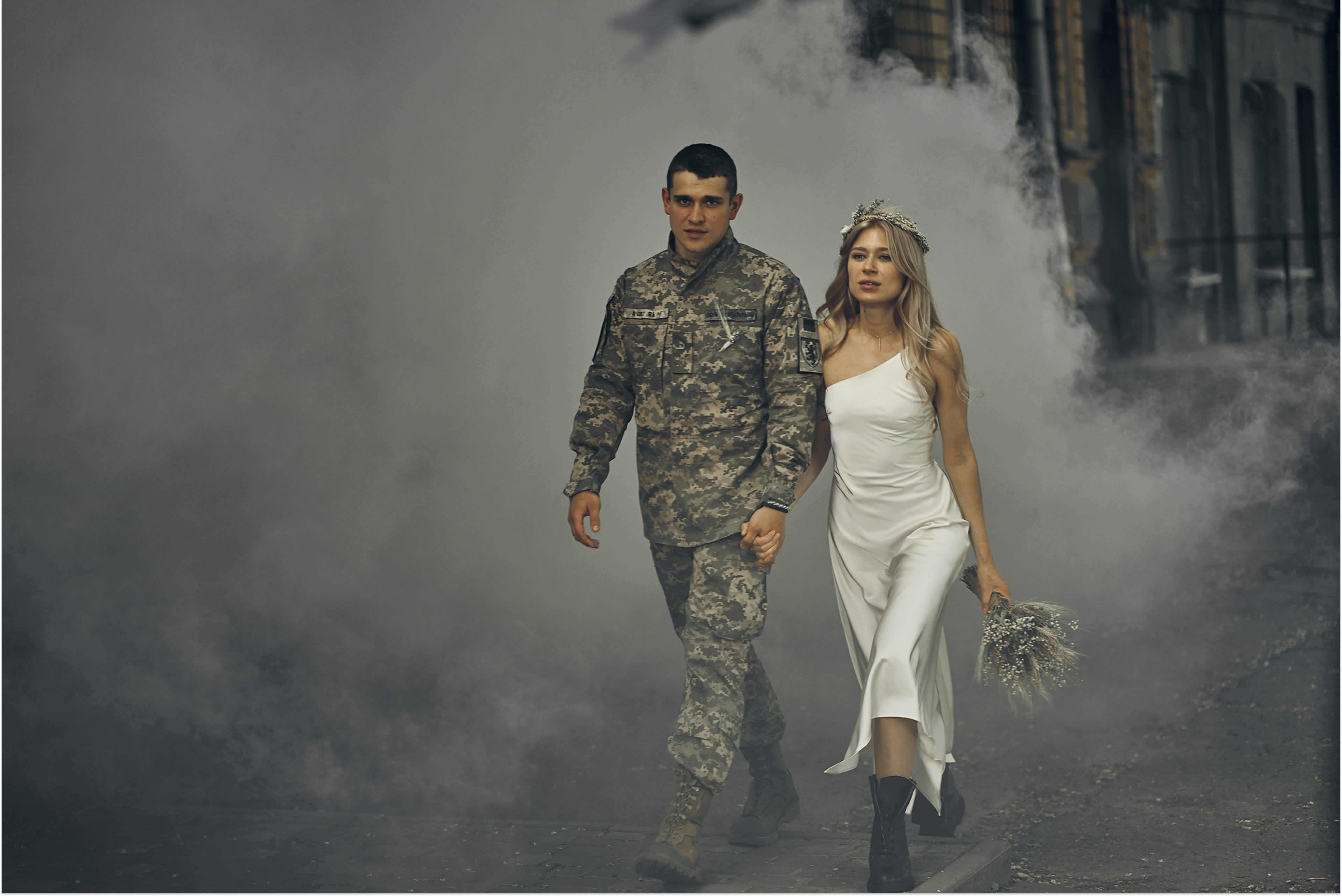 “Guerre & Amour” Ils sont mari et femme. Avant l’invasion de leur pays par la Russie, ces deux Ukrainiens étaient photographes de mariage et d’histoires de cœur. À 30 ans, ils sont devenus reporters de guerre parmi les soldats et le chaos. Les clichés de Vlada et Kostiantyn Liberov racontent autant le basculement de leur propre destin que celui de l’Ukraine. Un reportage photo à retrouver dans Kometa n°2  « Après six mois sur le front sans avoir vu sa fiancée, l’acteur ukrainien Maksym Devizorov, épouse la comédienne Svetlana Gordienko. » Dnipro, 21 mai 2022. — Vlada et Kostiantyn Liberov |