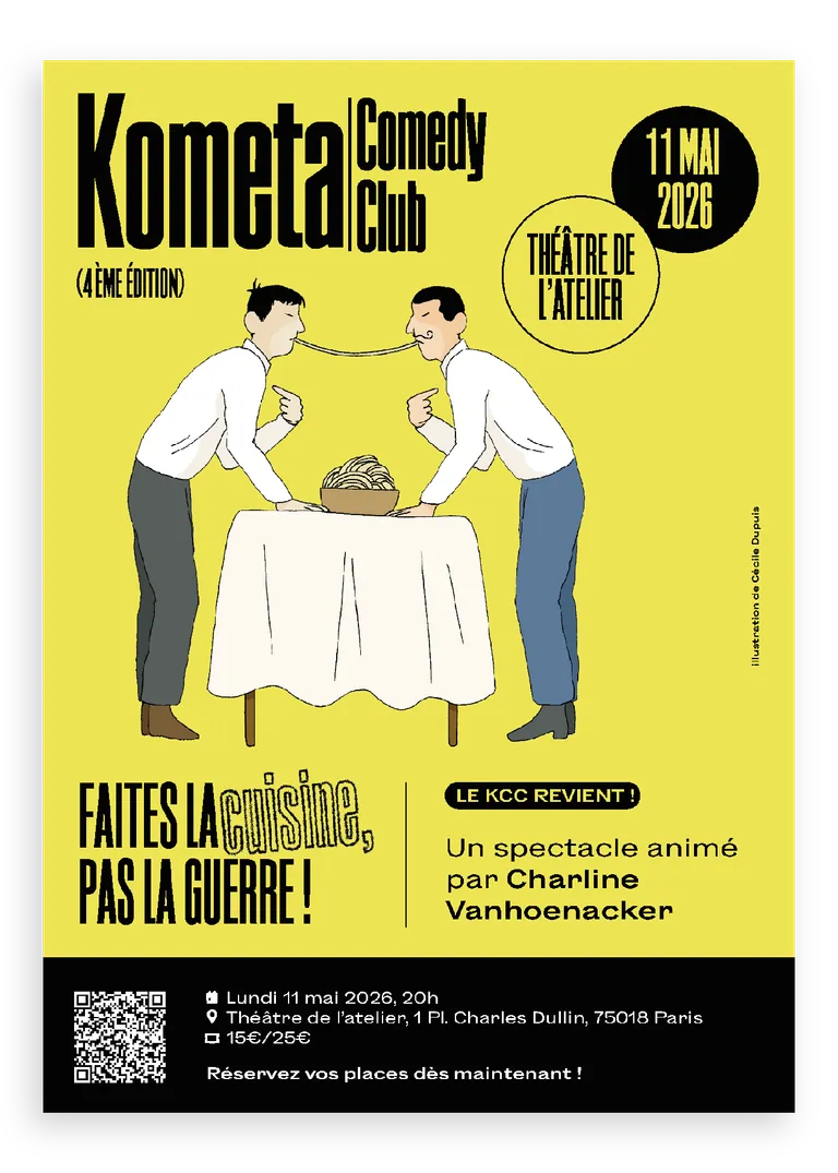 Dans cette nouvelle édition du Kometa Comedy Club, inspiré du numéro « Faites la cuisine, pas la guerre », la revue Kometa monte sur scène pour explorer un territoire aussi quotidien que explosif : la cuisine comme fait géopolitique.